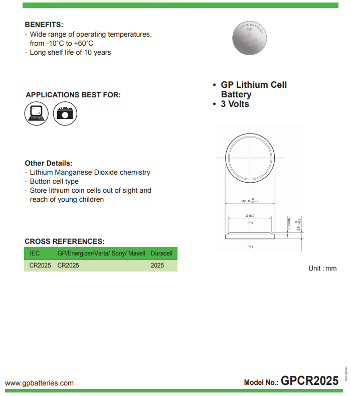 Pin cúc lithium GP CR2025 có mật độ năng lượng lớn và cung cấp thêm 30% công suất* cho các thiết bị chuyên dụng nhỏ như chìa khóa ô tô, điều khiển từ xa, đồng hồ thông minh, máy đo đường huyết, thiết bị thông minh trong nhà, thiết bị IoT, cảm biến cửa và cửa sổ. Với khả năng giữ năng lượng tuyệt vời và thời gian bảo quản lên đến 10 năm khi được bảo quản đúng cách ở nơi khô thoáng, bạn sẽ không bao giờ lo pin bị giảm hiệu năng. Pin được thiết kế để hoạt động tốt ngay cả trong điều kiện nhiệt độ khắc nghiệt từ -20°C đến +60°C. An toàn là ưu tiên hàng đầu – bản thân những viên pin này không chỉ có thiết kế chống rò rỉ để bảo vệ thiết bị của bạn, mà bao bì còn có thiết kế tinh tế, giảm thiểu nguy cơ nuốt phải dị vật ở trẻ nhỏ**.